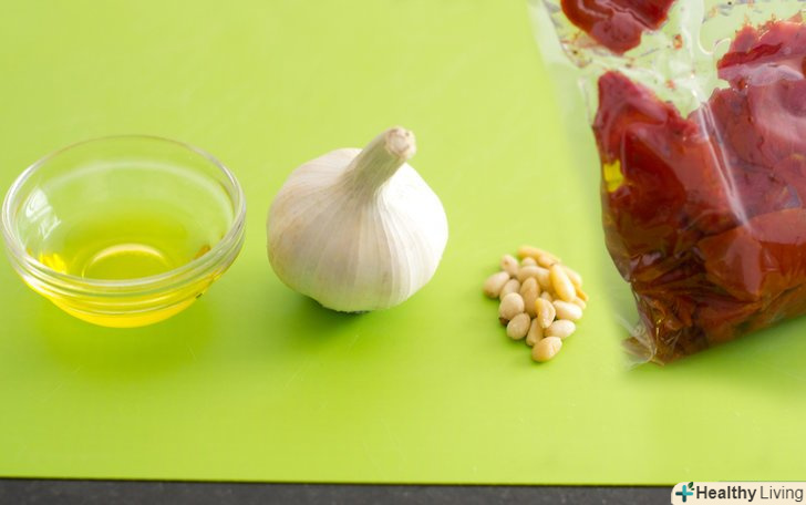 Зробіть песто з в'яленими помідорами замість базиліка.щоб приготувати дуже насичений, солодкий соус песто, змішайте в'ялені помідори разом з кедровими горіхами, часником і оливковою олією.