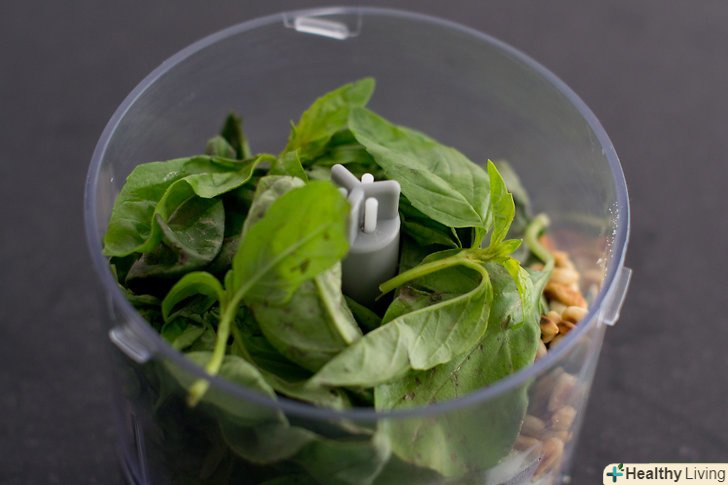 Покладіть нарізані інгредієнти і базилік в кухонний комбайн.поступово в міру обробки інгредієнтів додавайте оливкову олію.- Якщо у вас немає кухонного комбайна, в крайньому випадку, ви можете використовувати блендер. (Песто вийде ніжніше і менш зернисте при використанні кухонного комбайна.)