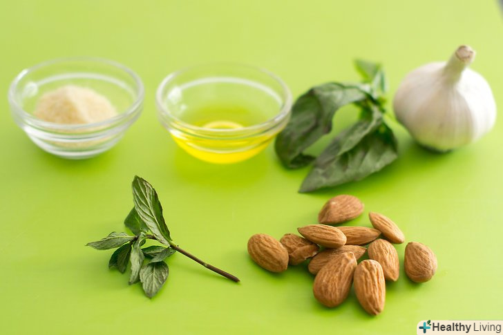 Додайте листя м'яти та мигдаль.до початкового рецепту песто дженовезе додайте трохи свіжого листя м'яти і мигдаль замість кедрових горіхів. Мигдаль може бути як обсмажений, так і не обсмажений.