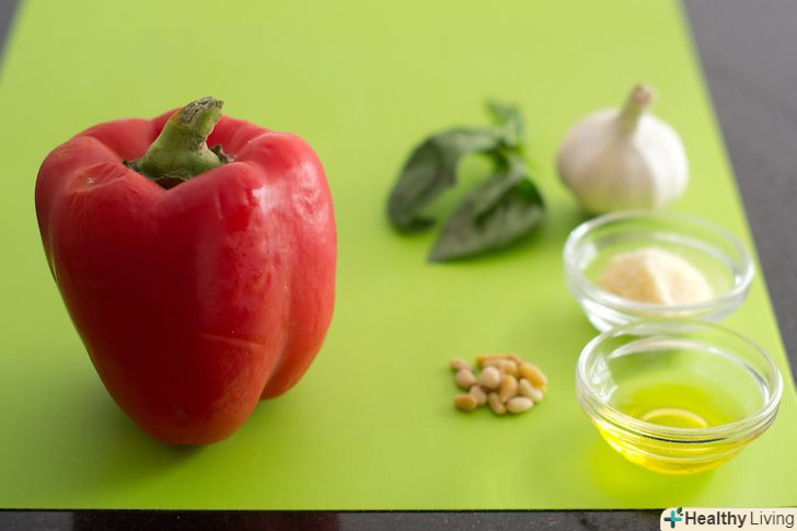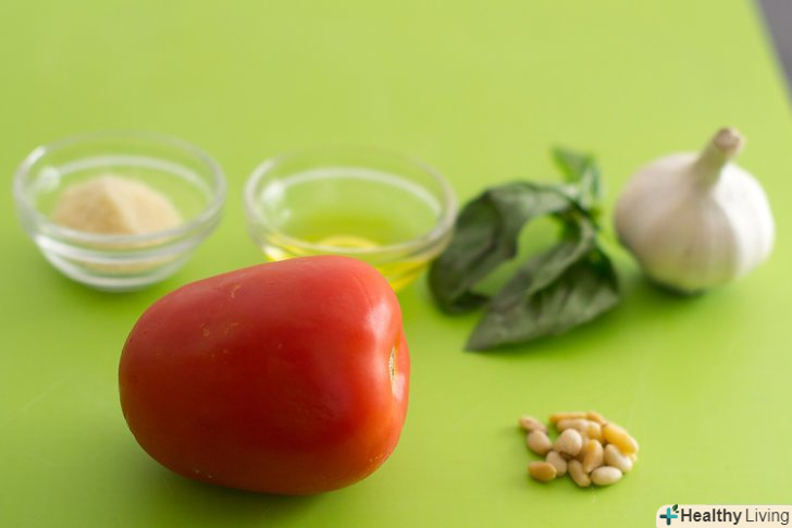 Зробітьпесто сициліана або червоний соус песто.Червоний песто схожий на традиційний, за винятком того, що в нього доданий помідор, менше базиліка, а кедрові горіхи замінені мигдалем.