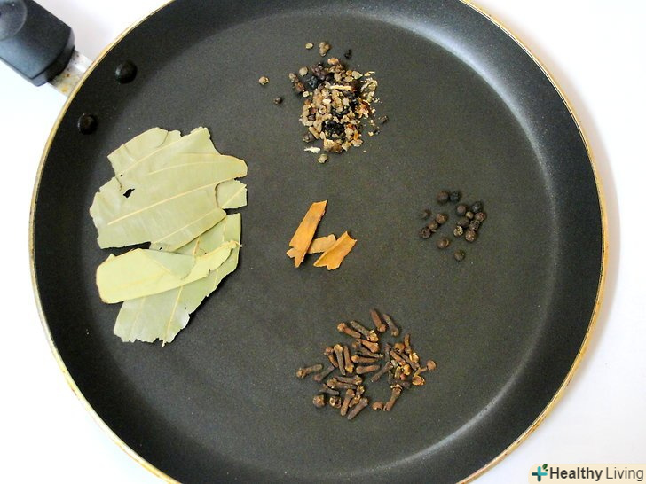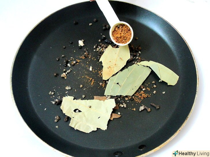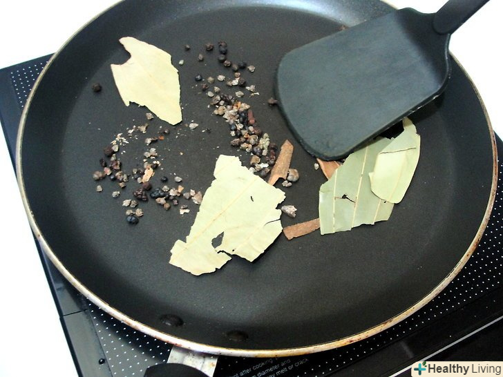 Нагрійте антипригарну сковороду від низької до середньої температури.додайте 1 ч.л цілої гвоздики, 3 або 4 лаврових листки, насіння 2 стручків зеленого кардамону і насіння 4 стручків чорного кардамону, 12 горошин чорного перцю і розламайте в сковороду кору касії.