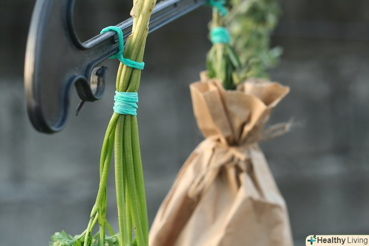 Сушіть трави в паперовому пакеті.Зв'яжіть пучок, прив'яжіть пучок до вішалки, сам пучок помістіть в паперовий пакет. Його теж треба закріпити. Пакет-це не тільки захист від зайвого світла, але ще і прекрасна пастка для насіння (якщо, звичайно, вони вам потрібні).