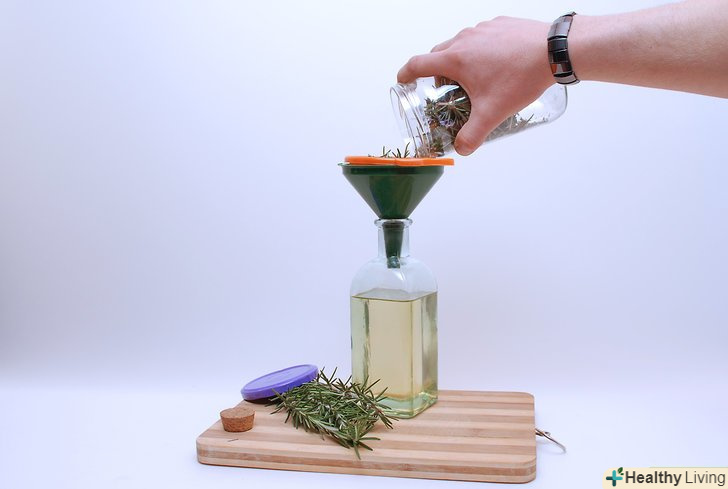 Після закінчення зазначеного терміну процідіть масло.перелийте його в контейнер для зберігання або назад в скляну банку. Тепер масло готове для використання наступними способами:- Налийте чверть склянки насиченого розмарином оливкового масла в ванну, коли це необхідно.