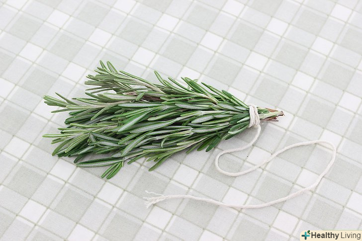 Збери гілочки в пучок, перев'язуючи мотузкою у кінців.зроби петлю з мотузки, щоб зручніше було підвісити пучок.- Або ж, можна використовувати тонкі гумки, щоб закріпити розмарин в пучку.