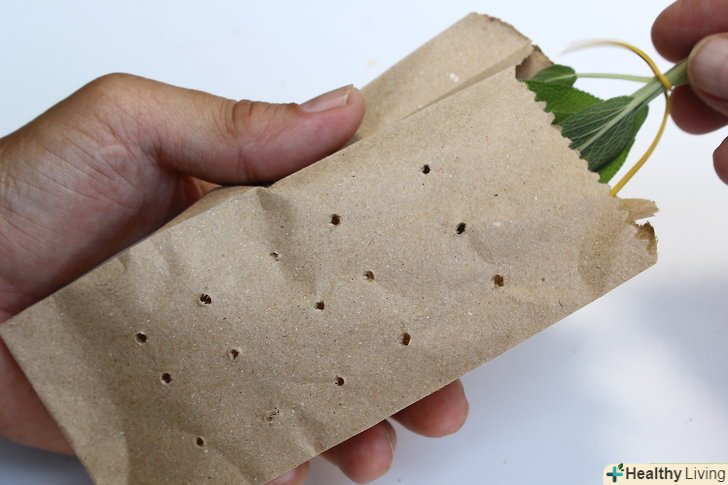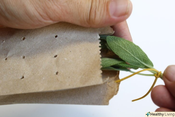 Покладіть пучки шавлії в паперовий мішечок з проробленими в ньому отворами.мішечок захистить листя від пилу, а отвори забезпечать циркуляцію повітря. Помістіть пучки в мішечок і залиште його відкритим.[9]- Якщо у вас немає паперових мішечків, можна загорнути пучки в марлю. Головне, ні в якому разі не кладіть листя в пластикову упаковку, інакше на них утворюється цвіль.[10]