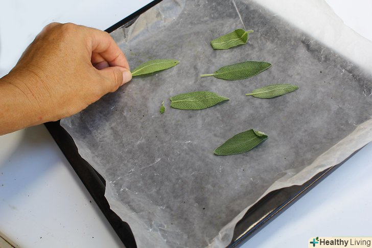 Розкладіть шавлія на деку.перш ніж класти шавлія, покладіть на деко Папір для випічки. Розкладіть листя так, щоб вони не торкалися і не перекривали один одного, інакше вони просушаться нерівномірно. Якщо одна частина листа просушиться більше іншої, згодом лист може поламатися.[26]