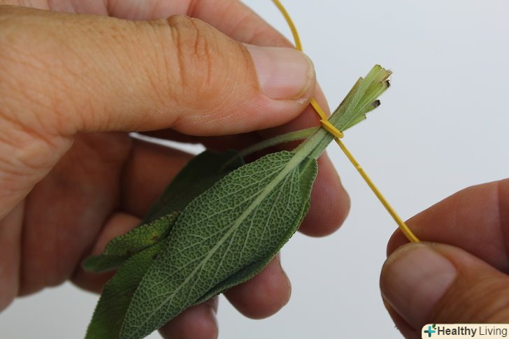 Зв'яжіть пучки ниткою, мотузкою або гумкою.закріпіть пучки, зв'язавши живці біля основи. Залиште невеликий відрізок нитки або прив'яжіть додатковий шматок нитки до зв'язки, щоб повісити пучок.- Якщо використовувати гумку, вузол буде затягуватися все тугіше в міру висихання шавлії. Завдяки цьому листя точно не випадуть з пучка.[8]