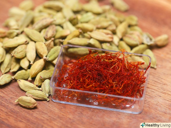 - Як тільки молоко закипить, додайте 2 столові ложки (30 мл) нарізаного мигдалю або мигдальних пластівців, 1/4 чайної ложки (1,25 мл) шафранових ниток, 1/4 чайної ложки (1,25 мл) подрібненого кардамону і 1-2 столових ложки (15-30 мл) меду. Кип'ятіть протягом 5 хвилин.[10]