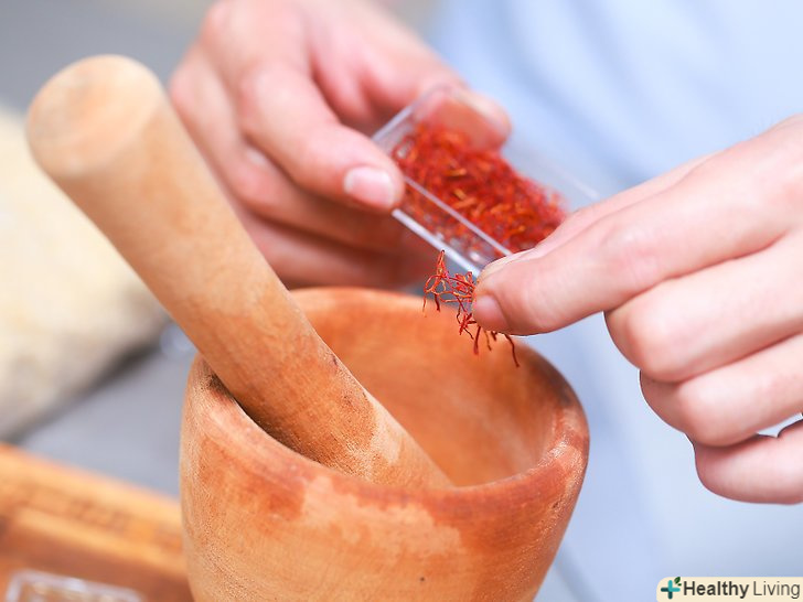 Подрібніть і замочіть нитки шафрану .завдяки подрібненню і замочуванню шафрану Ви отримаєте найбільш яскравий смак, тобто візьмете з ниток максимум, тому рекомендуємо завжди подрібнювати і замочувати шафран.- Візьміть необхідну кількість ниток шафрану і подрібніть їх в порошок в ступці за допомогою маточки. Якщо у вас немає відповідної ступки і маточки, ви можете зробити це пальцями.[2]