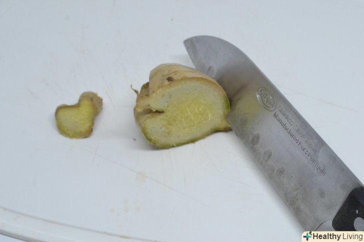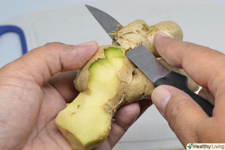 Почистіть імбир ножем для чищення овочів або овочечисткою.поставте імбир на одну сторону, після чого гострим ножем або овощечисткой зніміть з нього всю шкірку. Чистіть вниз, у напрямку до обробної дошки. Постарайтеся зняти якомога менше шкірки.[4]- Шкірку свіжого імбиру також можна спробувати зняти краєм ложки. Цей спосіб добре підходить для закруглених частин, до яких важко дістати ножем.[5]