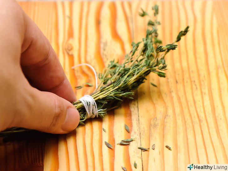 Оберніть кілька гілочок чебрецю мотузкою, створюючи пучок.ви можете зібрати стільки гілочок, скільки хочете, у вас вийде своєрідний «букетик». Не зв'язуйте пучок занадто туго, інакше ви зможете пошкодити гілочки.