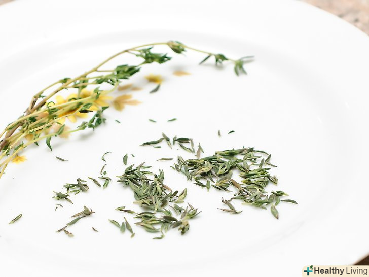 Відірвіть листя від стебел, використовуючи або пальці, або вилку.робіть це тільки після того. як ви вимили і підсушили чебрець.- Якщо ви відриваєте листя пальцями, акуратно тримайте чебрець за стебло однією рукою, іншою рукою відщипуйте листочки зверху вниз.