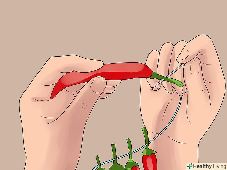 Нанизуйте перці на волосінь. Використовуйте велику голку, щоб проколоти перці. Проколюйте стебло, не чіпаючи сам плід.