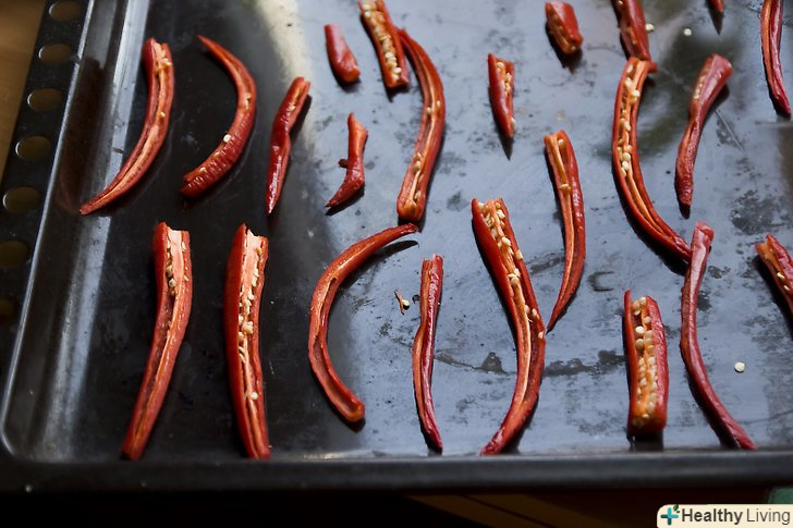 Запікайте перці в духовці протягом 6 годин.встановіть таймер, щоб бути впевненими, що перцям достатньо часу для висихання. Через 6 годин вимкніть духовку і залиште перці там на ніч, так вони продовжувати підсихати.