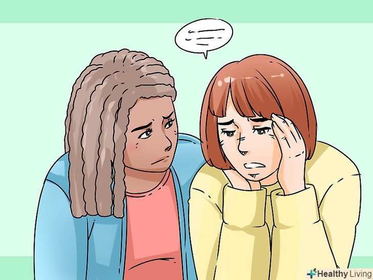 Проводьте час в розмовах з іншими.Оточіть себе друзями або членами сім'ї, які можуть зрозуміти ваші почуття. Поясніть, як ви себе почуваєте і подивіться, чи допоможе це. Є ймовірність, що вони спробують підняти вам настрій. Цілком прийнятно буде сказати їм, що ви сумуєте і вам потрібен час, щоб посумувати.[23]- Поговоріть з тими, кому ви довіряєте, хто старший за вас або мудріший. У такої людини може бути більше досвіду, що допоможе вам впоратися зі своїм смутком.