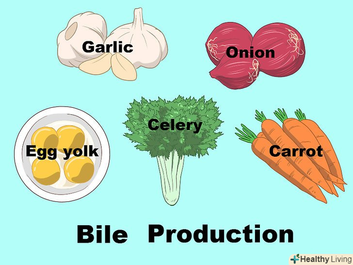Їжте продукти, які стимулюють вироблення жовчі. Збільшення вироблення жовчі прискорить обмін речовин. Це призведе до більш швидкого виведення нікотину з організму. Тому, чим більше продуктів, що стимулюють вироблення жовчі, ви з'їсте, тим швидше організм виведе нікотин разом з сечею і потім. До продуктів, що стимулюють вироблення жовчі, відносяться:[7]- Часник і цибуля;