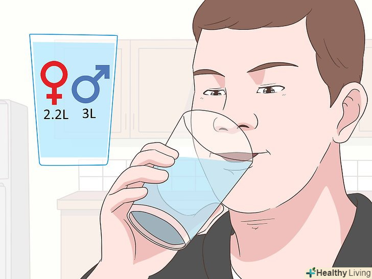 Щодня випивайте хоча б 2,2 літра води, щоб запобігти зневодненню.іноді судоми в ногах ночами можуть бути викликані зневодненням організму. Жінкам слід випивати близько 2,2 літра, а чоловікам — приблизно 3 літри води в день.[11]- Якщо ви не впевнені в тому, що п'єте достатньо води, зверніть увагу на ступінь прозорості сечі. Світла прозора сеча свідчить про те, що вам вистачає рідини, в той час як жовтувата сеча або рідкісне сечовипускання служать ознакою зневоднення.