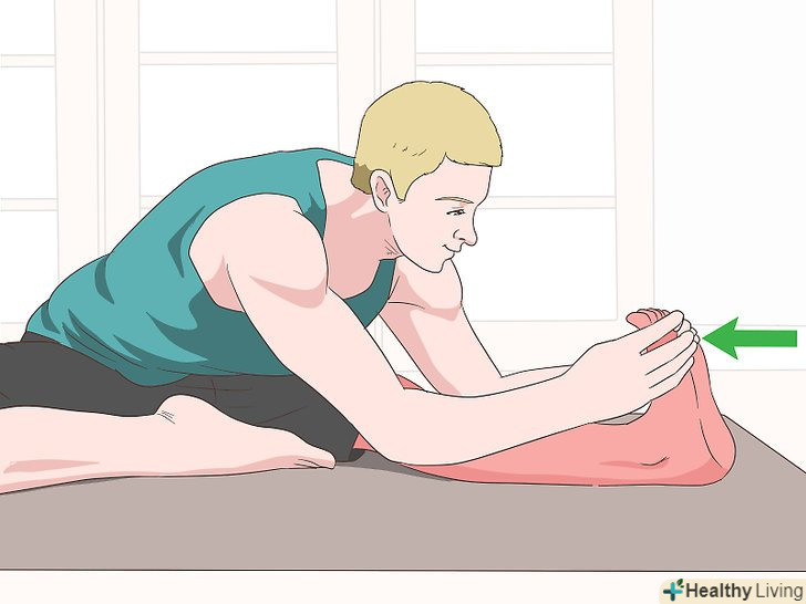 Сядьте і нахиліться вперед, щоб розтягнути внутрішні литкові м'язи.у положенні сидячи витягніть перед собою хвору ногу, другу ногу зігніть і нахиліться вперед, так щоб ваші груди наблизилася до коліна. Візьміться руками за нижню сторону пальців витягнутої ноги і як слід потягніть їх до себе.[2]- Якщо ви не в змозі повністю виконати дану розтяжку, просто нахиліться вперед і якомога далі витягніть руки у напрямку до носка хворої ноги.