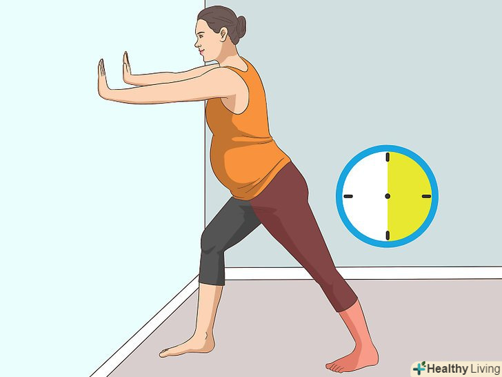 Зіпріться об стіну, щоб розтягнути литкові м'язи.нахиліться вперед і покладіть долоні на стіну, потім зробіть крок вперед здоровою ногою. Хвора нога повинна залишатися прямою. Повільно перенесіть вагу тіла на виставлену вперед ногу, поки не відчуєте натяг в литкових м'язах хворої ноги. При цьому стопа хворої ноги повинна повністю залишатися на підлозі. Утримуйте розтяжку 15-30 секунд.[3]- Слід повторювати цю розтяжку до тих пір, поки не пройдуть судоми в ікрі.