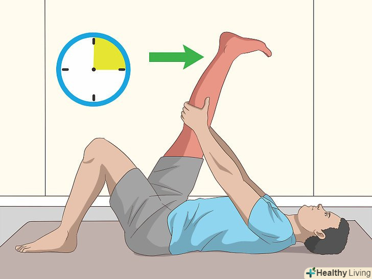 Ляжте і підніміть ногу, щоб розтягнути підколінні м'язи і сухожилля.ляжте на спину і зігніть здорову ногу в коліні, так щоб її стопа залишалася на підлозі. Витягніть і підніміть хвору ногу і дотягніться до неї руками (нога повинна залишатися прямою). Утримуйте розтяжку протягом 10-15 секунд.[4]- Підтягуйте ногу до себе за задню сторону стегна, а не за коліно, щоб як слід розтягнути підколінні м'язи і сухожилля.