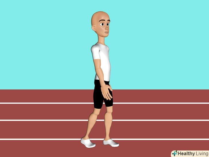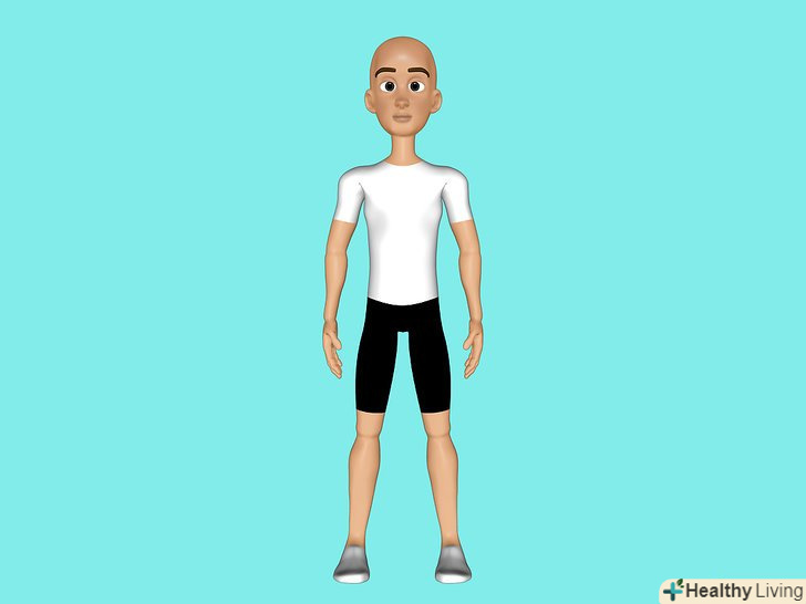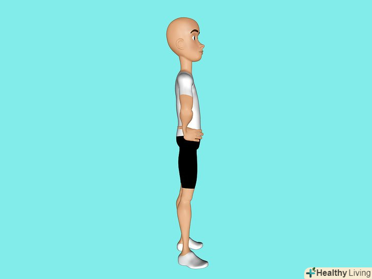 Встаньте рівно, поставивши ноги на ширині плечей.Покладіть руки на стегна. Втягніть живіт.- Розслабте голову, підборіддя дивиться вниз, встаньте ще рівніше і розслабте ваші плечі настільки, наскільки це можливо. Дуже важливо, щоб ви стояли в правильному положенні під час випаду.