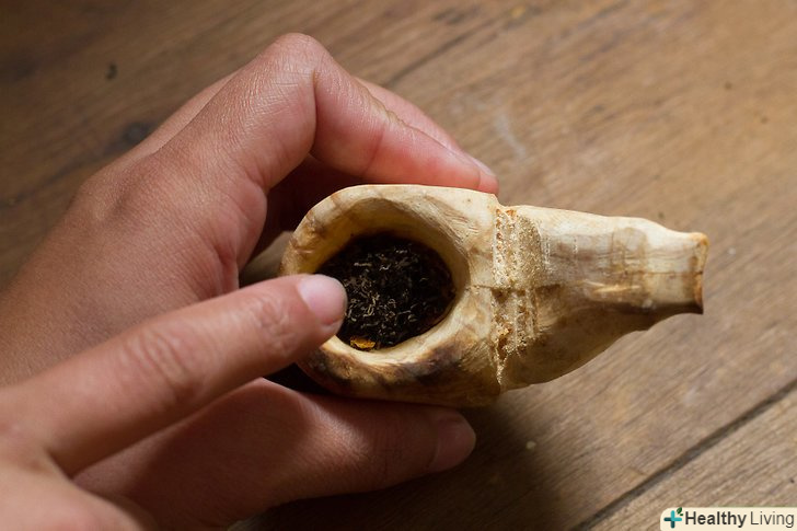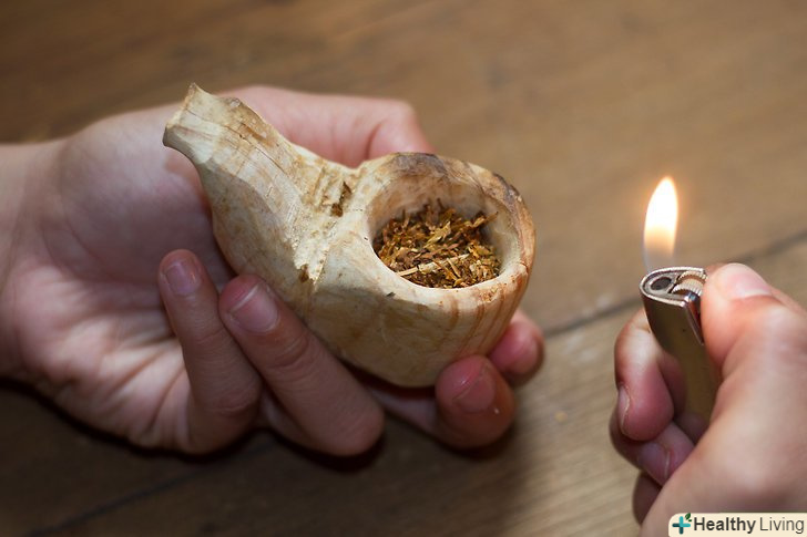 Запаліть її. Ви можете взяти одну з безлічі химерних запальничок для трубок, але ваш вірний Bic зробить все добре. Не використовуйте Zippo, отримайте смак бензину. Запаліть, тримайте запальничку зверху нахиленої чаші, клацайте. Раскуривайте ТІЛЬКИ РОТОМ. Не затягуйтеся! Пих, Пих – Пих-випустіть дим. Смак першого диму буде далеко не такий хороший, як смак наступного, так що, просто розкуріть її.