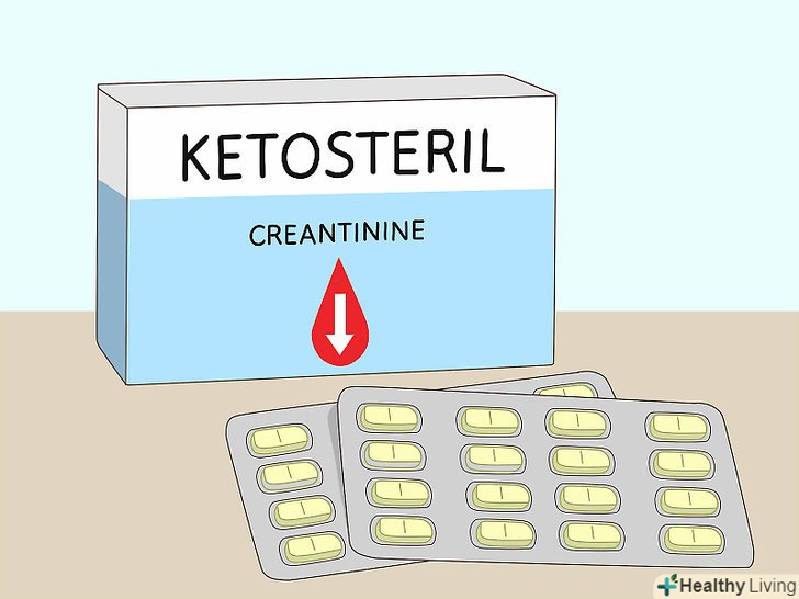 Приймайте ліки, що знижують рівень креатиніну. Часто в таких випадках призначають кетостерил. Поговоріть з лікарем про цей препарат – він може підійти вам. Зазвичай його призначають в дозуванні 4-8 таблеток тричі на день з їжею. [9] також вам можуть призначити харчові добавки:- Добавки з альфа-ліпоєвою кислотою покращують роботу нирок і нейтралізують токсини, в тому числі креатинін. Щодня необхідно приймати 300 міліграмів альфа-ліпоєвої кислоти. [10]