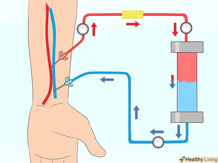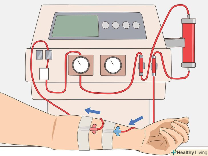 У критичній ситуації розгляньте такий варіант лікування, як діаліз. якщо зміни в раціоні і препарати не зможуть знизити рівень креатиніну в крові, поговоріть з лікарем про діалізі. Є два типи діалізу, але для зниження креатиніну використовується гемодіаліз. [14]- При процедурі гемодіалізу спеціальний прилад відфільтровує токсини, рідину і сіль з крові. Робиться це для того, щоб полегшити роботу нирок.