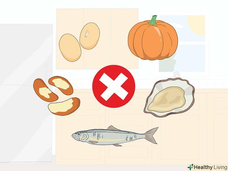 Уникайте продуктів з великим вмістом фосфору. якщо у вас підвищений рівень креатиніну, ниркам буде складно переробляти таку їжу. [17] тому слід обмежити споживання наступних продуктів:- Гарбуз, кабачки, сир, риба, молюски, горіхи, свинина, нежирні молочні продукти, соя.