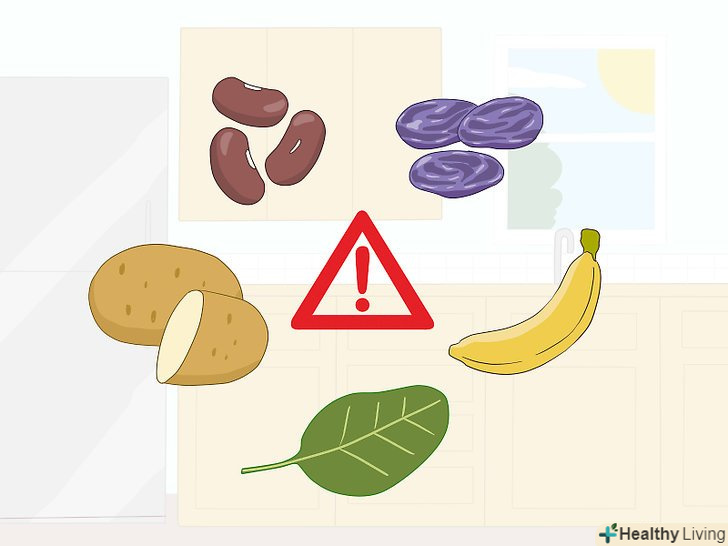 Обмежте вживання калію. при проблемах з нирками слід уникати продуктів, багатих калієм, оскільки калій може накопичуватися в організмі, якщо нирки не можуть його виводити в потрібних кількостях. Банани, сухофрукти, горох, боби, шпинат і картопляні продукти, такі як чіпси і картопля фрі. До продуктів з великим вмістом калію відносяться:- Сухофрукти, банани, шпинат, картопля, боби, горох.