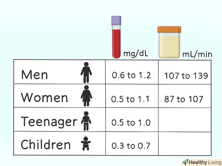 Інтерпретуйте результати. рівень креатиніну залежить від віку і статі. Крім того, на рівень креатиніну впливає вага людини. Нижче ми наводимо стандартні значення.- Нормальний рівень креатиніну в крові: [2]