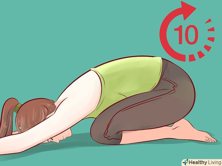 Потягніть м'язи нижньої частини спини. ляжте на спину, підтягніть коліна до грудей. Потягніться головою до колін. Затримайтеся в цьому положенні як мінімум на 10 секунд, потім опустіть голову і ноги. Повторюйте до тих пір, поки не відчуєте, що м'язи почали розслаблятися. Можна навіть розгойдуватися з боку в бік або від шиї до сідниць. Не робіть різких рухів. Спробуйте виконувати наступні вправи: [18]- Поза дитини. Сядьте на коліна, потім опустіть сідниці на п'яти. Витягніть руки перед собою, опустіться на підлогу і спробуйте витягнути руки якнайдалі. Ви повинні відчути натяг в нижній частині спини. [19]