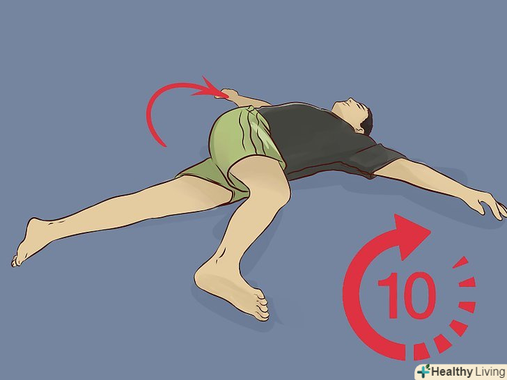 Потягніть бічні м'язи. ляжте на спину, витягніть руки вздовж тулуба. Зігніть одну ногу в коліні і повільно перекотіться на сторону, протилежну зігнутому коліну. Тягніться якнайдалі, намагаючись утримувати лопатки на землі. Затримайтеся в цьому положенні на 10 секунд, потім виконайте вправу з іншого боку. Повторіть вправу по 10 разів з кожного боку. [20]