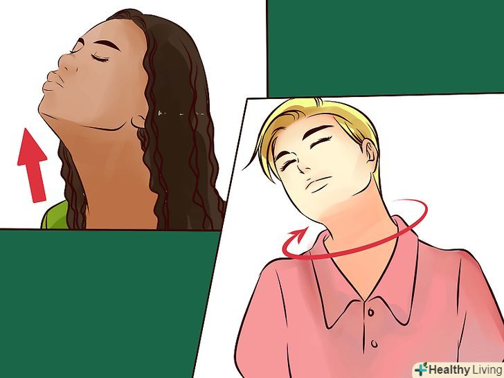 Потягніть шию. Станьте або сядьте з прямою спиною. Опустіть голову вниз, щоб відчути натяг в шиї. Потім почніть обертати головою: підтягніть підборіддя до грудей, потім опустіть ліве вухо до лівого плеча, потім праве вухо до правого плеча. Повторіть з початку.