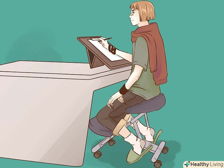 Захищайте спину під час роботи. тримайте спину рівно. [39] сидіть з прямою спиною, не нахиляйтеся вперед і не сутультесь. Купіть ергономічне крісло для роботи за столом. Це буде корисно для постави в цілому. Якщо більшу частину дня ви змушені сидіти, намагайтеся частіше вставати і ходити.- Використовуйте ортопедичну накладку на сидіння. Вона дозволить зберігати правильний вигин хребта в сидячому положенні. Завдяки цьому хребет не буде викривлятися. Якщо ви проводите багато часу в машині, купіть накладку на сидіння. [40]