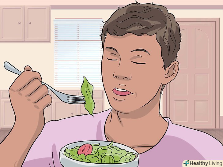 Перекушуйте фруктами і овочами. у них багато вітамінів і клітковини і мало жиру і холестерину. Їжте 4-5 порцій фруктів і 4-5 порцій овочів в день. Це дорівнює приблизно 2-2, 5 чашкам фруктів і овочів. Щоб з'їдати більше цих продуктів: [14]- Починайте обід або вечерю з салату. Якщо ви спочатку з'їсте салат, ви не будете голодні, коли дійдете до більш жирних і калорійних страв на зразок м'яса. Це дозволить вам контролювати розмір порції. Робіть салати з самих різних фруктів і овочів: салат та інші листові овочі, огірки, морква, помідори, авокадо, апельсини, яблука.