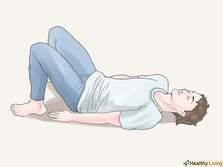 Відшукайте зручне положення,щоб почати розслаблююче дихання. для багатьох людей, які відчувають біль у спині, найкращим буде положення лежачи плазом на килимку для йоги або ліжка з подушкою під колінами. Помістіть руки на верхню частину живота.- Може, вам зручніше буде прямо сісти на стілець, роблячи упор на поперек. Хороша постава стане вірною ознакою того, що ви правильно дихаєте.