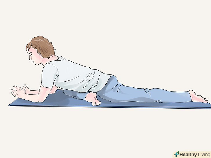 Залишайтеся в цьому положенні 3-5 хвилин, глибоко дихаючи. Покладіть руки на голову і нехай вони спираються на землю для додаткової розтяжки спини. Покладіть їх назад долонями догори для додаткової релаксації.- Ваш лоб може доторкатися до підлоги або лежати на блоці, як вам зручніше.