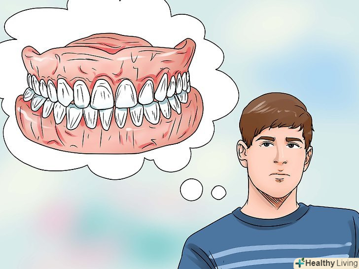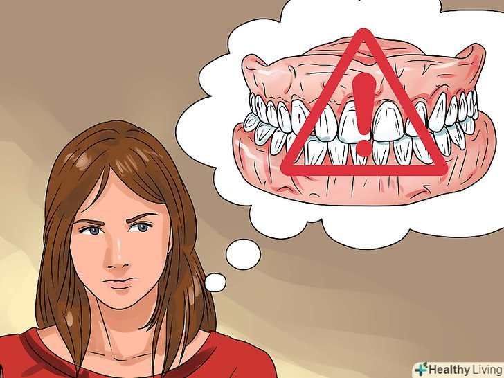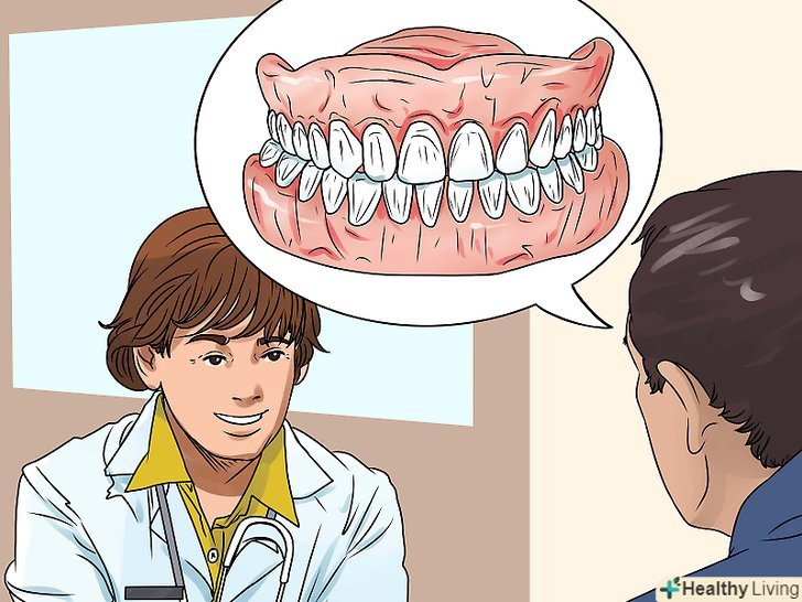 - Якщо ви використовуєте протези, то регулярно стежте за їх станом. Знімайте протези, коли лягаєте спати.[8] часткові зубні протези мають металеві скоби, які з часом руйнуються. Слідкуйте за станом протезів, щоб випадково не проковтнути їх під час їжі.