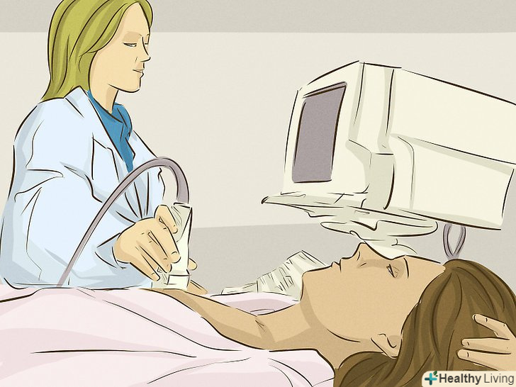 Зробіть УЗД грудей, якщо лікар призначить його.[13] Ультразвук дозволяє оцінити стан грудей іншим способом. На УЗД видно щільні освіти і кісти (кісти, як правило, наповнені рідиною, і через них переживати не варто, оскільки в них немає ракових клітин).- Ультразвук також може допомогти зрозуміти, чи потрібна біопсія (дослідження, при якому береться зразок тканини освіти тонкою голкою і вивчається під мікроскопом).[14]