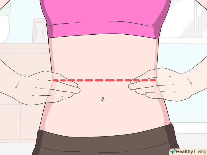 Знайдіть талію.Руками намацайте на боках верхню частину стегон і підставу грудної клітини. Талія розташовується в м'якій зоні між цими ділянками з виступаючим кістками.[1] талія являє собою саму вузьку частину торсу, яка зазвичай знаходиться на рівні пупка або трохи вище.