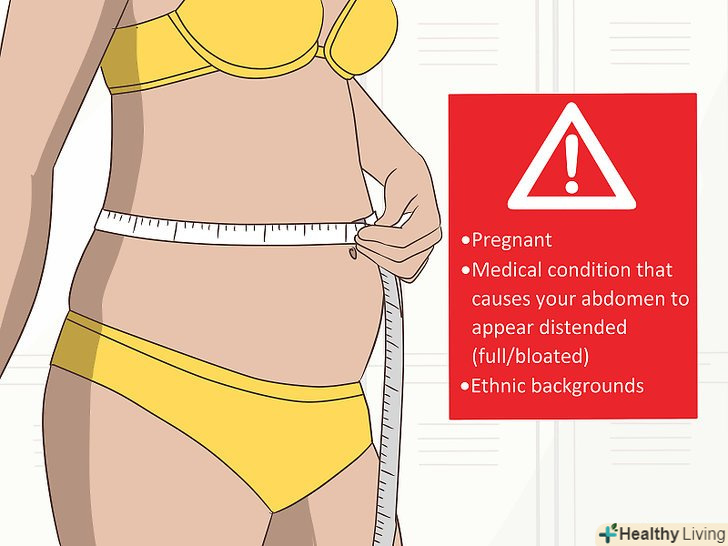 Врахуйте можливі фактори, які можуть нівелювати користь ваших вимірювань.у деяких ситуаціях обхват талії не можна вважати надійним показником стану вашого здоров'я. Наприклад, якщо ви вагітні або хворі таким захворюванням, яке призводить до збільшення живота, через що значення обхвату талії може виявитися бПрольшім навіть тоді, коли ви перебуваєте у відмінному стані. Аналогічним чином на збільшений обсяг талії може впливати етнічне походження людини, зазвичай це характерно для китайців, японців, азіатів, аборигенів і остров'ян Торреской протоки.[7]