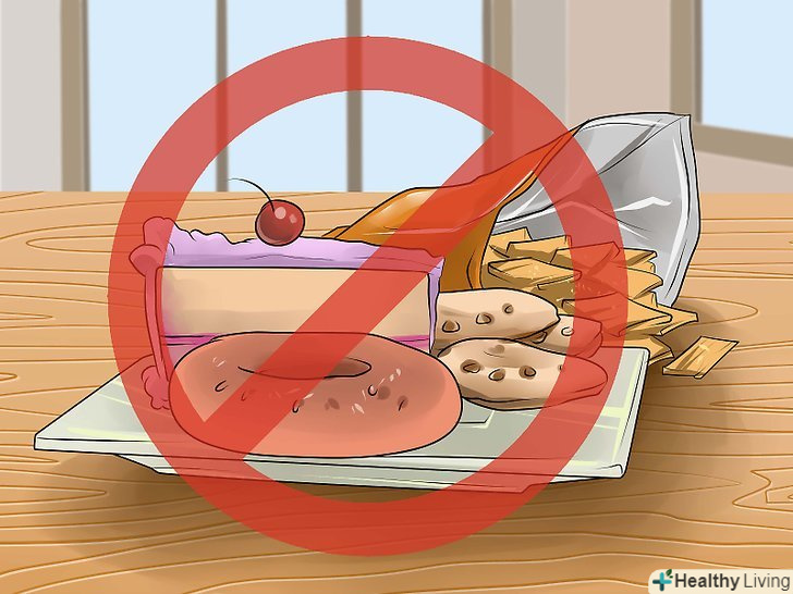 Виключіть зі свого раціону продукти харчування з високим вмістом жирів і натрію.їжу, яка містить велику кількість жирів, (а також напівфабрикати) потрібно виключити зі свого раціону харчування. Крім того, було б дуже корисно зменшити споживання натрію. Продукти харчування, що містять натрій у великих кількостях, можуть посилити больовий симптом під час менструації.[7]- До того ж, краще відмовитися від їжі, яка містить трансжири. Трансжири містяться в таких продуктах, як печення, крекери, торти, картопля фрі, цибульні кільця, пончики (донати) і маргарин.[8]