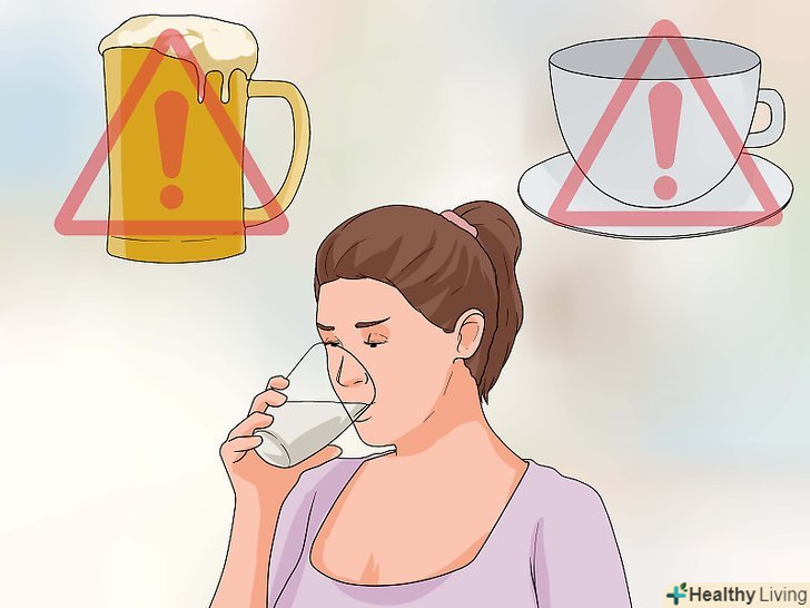 Обмежте вживання кофеїну і алкоголю. Алкоголь і кофеїн впливають на нейрорегуляторную систему. Хоча точна причина мігрені не відома, багато лікарів сходяться на думці, що мігрені можуть бути наслідком змін в нейрорегуляторной системі.[17]- У невеликих кількостях кофеїн підсилює ефект парацетамолу, коли біль тільки починає проявлятися. Часто достатньо однієї чашки кави і таблетки парацетамолу. Якщо ви вип'єте багато кави (більше двох чашок), через якийсь час у вас може виникнути рикошетна (лікарсько-індукована) головний біль.