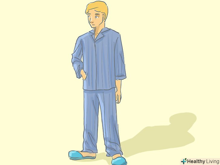 Одягніть свою улюблену піжаму.вибирайте зручну і м'яку тканину. Це може бути бавовняна футболка або махровий халат. М'який матеріал допоможе тілу розслабитися. Також важливо, щоб тканина утримувала тепло, але при цьому пропускала повітря, щоб уникнути перегріву.- Флісова тканина відмінно утримує тепло і відводить вологу.[11]