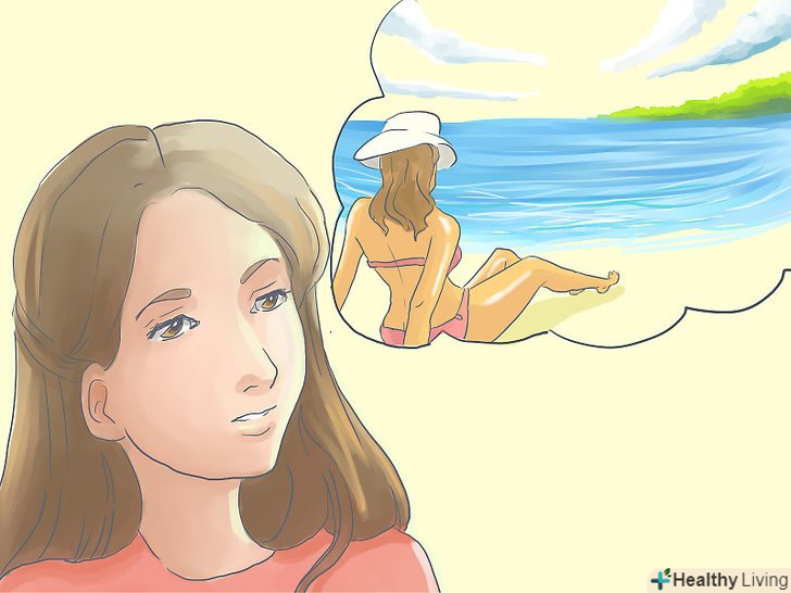 Уявіть собі спокійне місце.для розслаблення можна згадати тихе містечко або приємний момент з минулого. Коли ви перенесетеся на пустельний пляж або почнете згадувати дорогу в школу, постарайтеся зосередитися на деталях, щоб заспокоїти свою свідомість.[9]