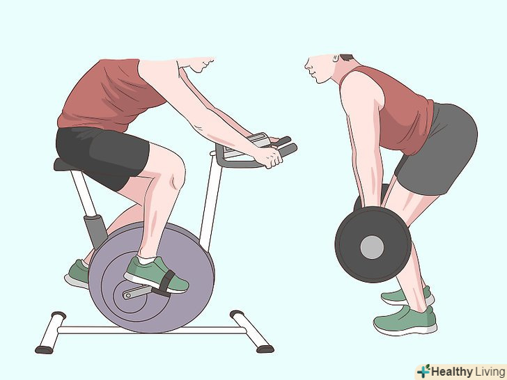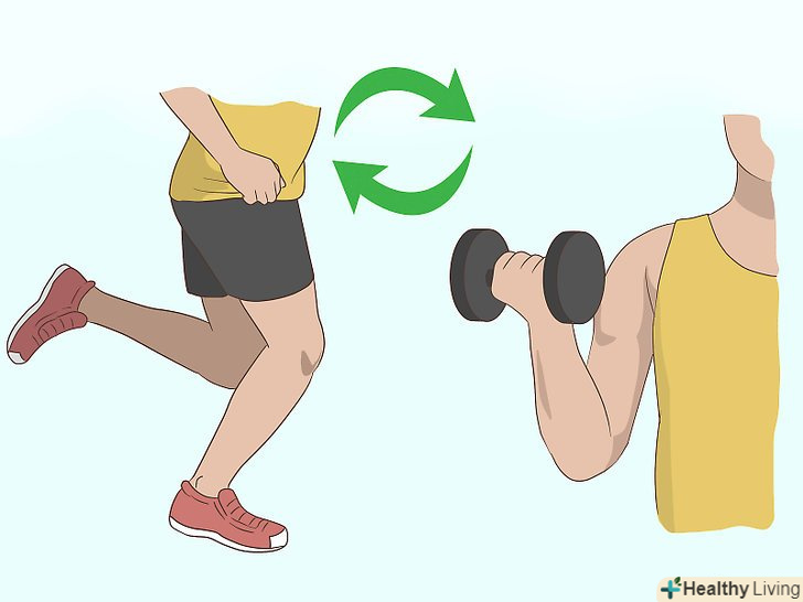 Чергуйте різні види фізичних навантажень.якщо ви можете пробігти 8 км без зупинки або підняти гантелі великої ваги, це не означає, що ви здорові. Якщо ви будете виконувати тільки одну вправу, то ви будете тренувати тільки одну групу м'язів.[13] спробуйте інші види вправ, наприклад плавання або тренування м'язів кора, і ви будете здивовані, що не зможете впоратися з ними!- Що робити? Чергувати тренування. Навантаження різних груп м'язів покращує тренованість і запобігає травми, а також не дає нудьгувати. Включайте в план тренувань аеробні та силові заняття. Ваші м'язи будуть раді таким навантаженням.