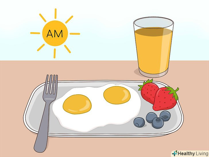 Снідайте.Легкий здоровий сніданок-запорука здоров'я. Завдяки сніданку, що містить нежирний білок і цільні злаки, вам не потрібно буде перекушувати до обіду. Дослідження показали, що ті, хто не снідає, їдять більше. Щоб не переїдати протягом дня, не пропускайте сніданок.- Замість шоколадного тістечка і кави віддайте перевагу Сніданку з пари яєць і яких-небудь фруктів, запивши їх знежиреним молоком, апельсиновим соком або чаю. Чим ситніше сніданок, тим більше енергії ви будете відчувати і менше з'їсте протягом дня.[3]