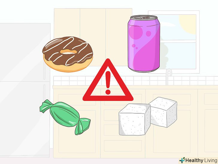 Обмежте споживання цукру.вуглеводи-це важлива частина раціону, але швидкі вуглеводи шкідливі для здоров'я. Вони сприяють швидкому сплеску енергії, а потім швидкому її зниженню, що викликає відчуття голоду. Швидкі цукру, крім тих, що містяться у фруктах, висококалорійні і не містять корисних речовин. Уникайте швидких вуглеводів і додавання цукру, однак можна споживати цукор в обмежених кількостях.[7]- Фрукти містять прості цукри, але вони можуть бути частиною здорового раціону, оскільки вони повні вітамінів і поживних речовин. По можливості їжте фрукти з шкіркою.