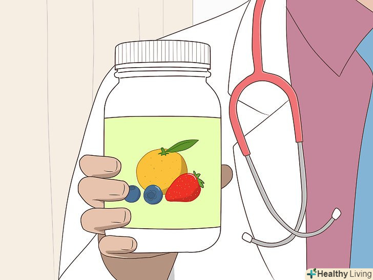Обговоріть з лікарем, чи необхідно вам приймати харчові добавки.харчовими добавками можуть виявитися вітаміни або мінерали. Прийом добавок збільшує всмоктування поживних речовин з їжі. Ви можете приймати полівітаміни щодня або приймати моновітаміни, дефіцит яких у вас є, наприклад, дефіцит кальцію, вітаміну D або B12.[9]- Не починайте прийом вітамінів без консультації з лікарем, особливо якщо ви вже приймаєте будь-які препарати.